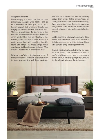 is inviting and free of clutter. Take away coats Depersonalise, but don’t lose everything Rebecca says “When staging your home, if you’re pitching a space as a bedroom or a